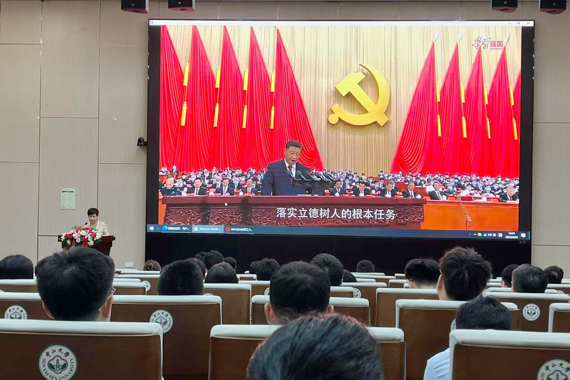 会议伊始,全体教职工集中观看了《习近平的教师情》专题片,重温了习近平总书记对教师的嘱托与期望。