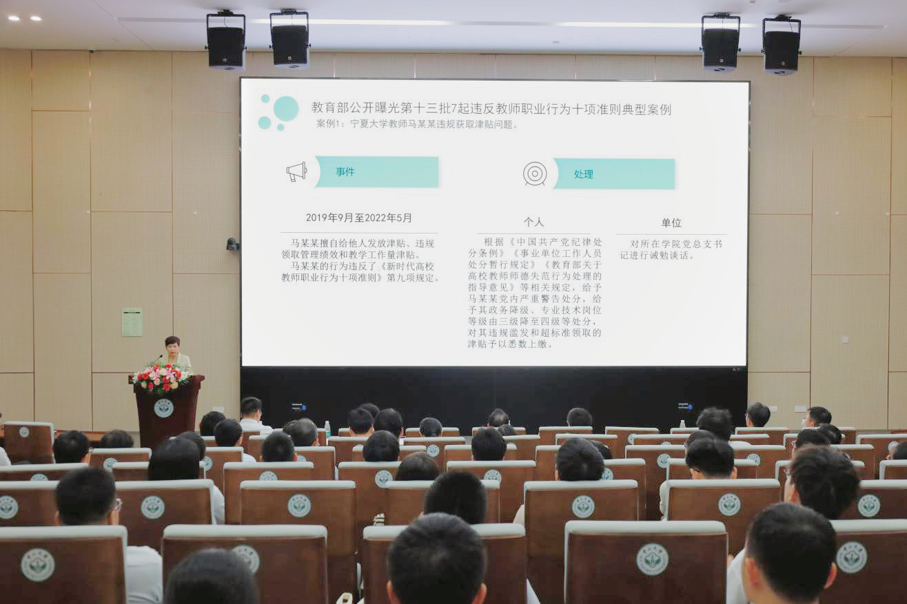 宣誓仪式结束后,学院党委戴红晖书记作师德警示教育,会议通报了教育部公开曝光的第十三批违反教师职业行为十项准则典型案例,强调全体教职工要心怀敬畏之心,涵养高尚师德,强化底线红线意识,切实增强遵守教师职业行为十项准则的思想自觉和行动自觉。