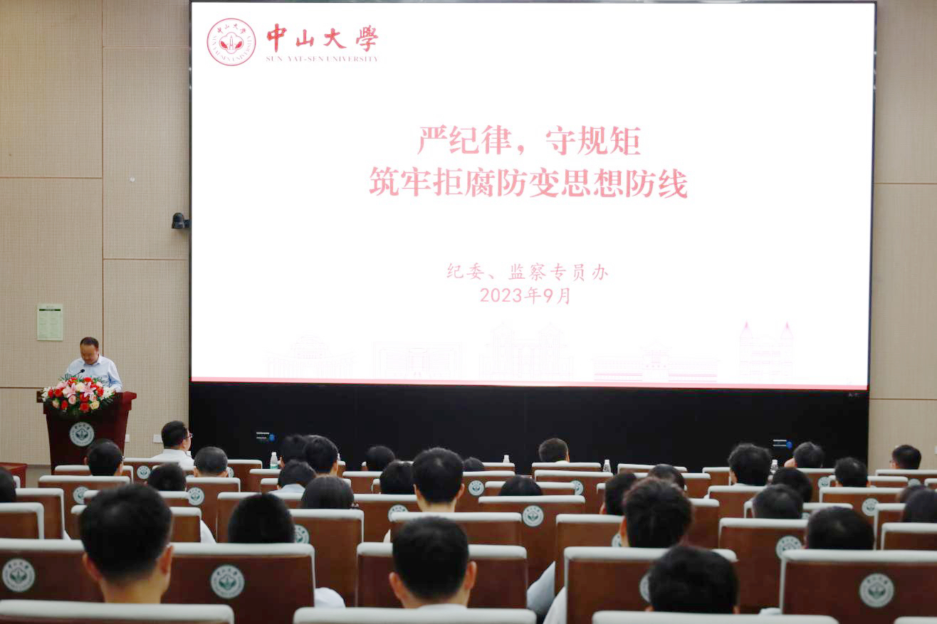 中山大学纪委、监察专员办办公室主任杨国志为全体教职工作纪律教育专题报告。杨主任首先传达了习近平总书记关于纪律建设的重要讲话精神,强调了纪律建设的重要性及必要性,点明教师承担着为党育人、为国育才的光荣使命,号召广大教师要坚定理想信念、陶冶道德情操、涵养扎实学识、勤修仁爱之心,牢固树立“躬耕教坛、强国有我”的志向和抱负。接着,杨主任以案释纪、以案为鉴,对照《中国共产党纪律处分条例》剖析现实案例,深入浅出地为大家介绍了《条例》的内容和“纪律红线”。杨主任希望各位教职工牢记初心使命,自觉加强师德修养,成为潜心教书育人榜样楷模。