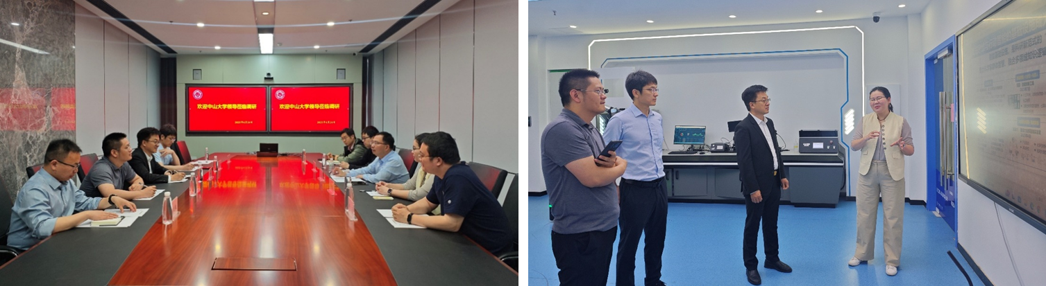 当天上午,侯仰龙一行首站前往精准智能化学全国重点实验室。实验室副主任江俊教授、朱濯缨教授、王嵩副教授、朱青副研究员、冯硕副研究员热情接待,并带领参观“机器化学家”实验平台。在交流座谈会上,江俊系统介绍了实验室的使命定位,以数据智能驱动化学研究范式变革,突破传统“试错法”的局限,实现化学知识数字化、化学操作指令化、化学创制智能化的新模式。实验室依托自主研发的“机器化学家”平台,构建了覆盖文献阅读、实验设计、数据分析的全流程智能系统,大幅度缩短了材料的研发周期。双方围绕人工智能技术如何促进研究范式的数字化和智能化转型这一话题展开深入探讨,并针对未来中山大学与中国科学技术大学在AI实验室方面的合作达成了初步共识。