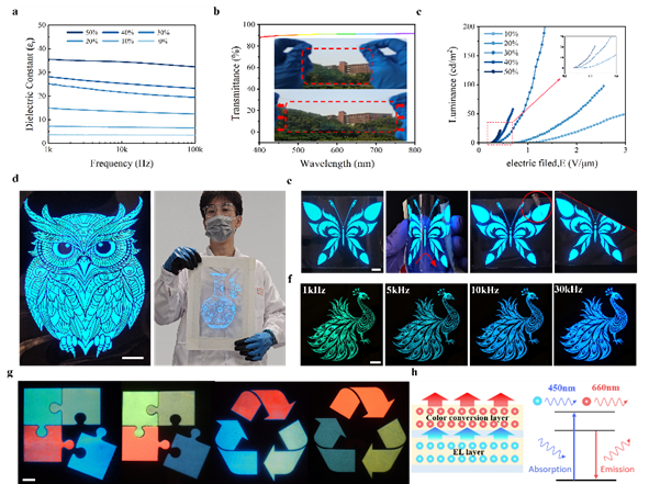 图2. 介电凝胶及ACEL器件的发光性能测试及展示