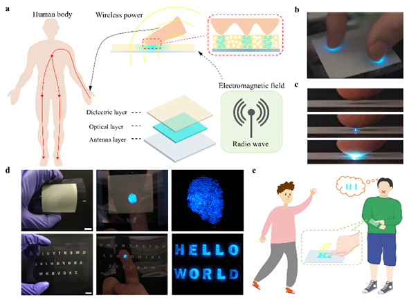 在此基础上,研究团队利用该油墨开发了无线触控发光器件,通过采集环境电磁能量并借助人体-地回路实现了无需电池和芯片的触控发光。该器件可直观呈现指纹和文字图案,为未来的无障碍交互、智能可穿戴显示和信息安全识别提供了全新的思路。